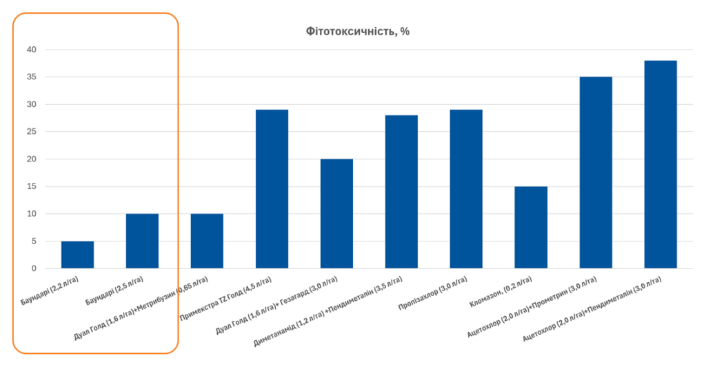 При цьому за умови навіть надмірного зволоження Баундарі® не справляє фітотоксичності на сходи сої.