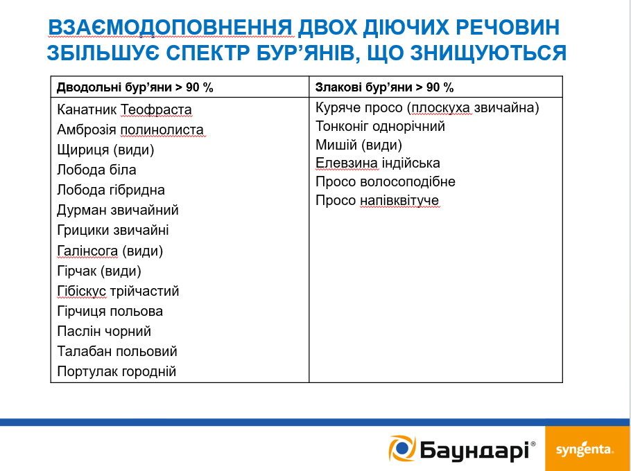 До того ж Баундарі® переважає відомі ґрунтові гербіциди за спектром ефективності проти амброзії полинолистої та канатника Теофраста, а також відмінно контролює однорічні злакові бур’яни завдяки тому, що метрибузин справляє часткову дію на просоподібні види бур’янів і куряче просо, а отже, разом із S-метолахлором, працюючи в синергії, демонструє чудову ефективність і проти злакових бур’янів.
